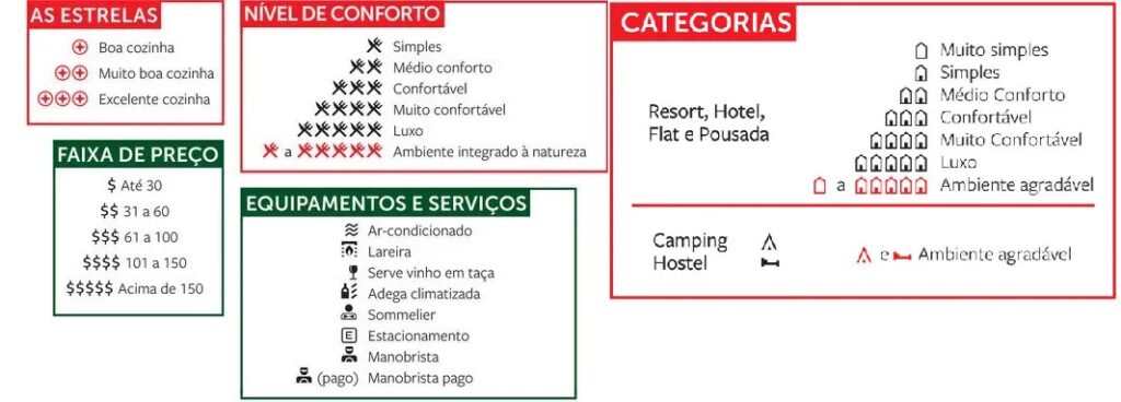 Ainda na questão dos restaurantes, haviam as “estrelas culinárias” (de uma a três, que a Embratur não conseguiu proibir) que representavam a qualidade da cozinha e os cifrões (de um a cinco) que avaliava o custo médio de uma refeição no local. Era normal esperar ansiosamente pelo lançamento da edição para saber quais locais ganharam estrelas ou perderam, além da eleição do Chef do Ano.